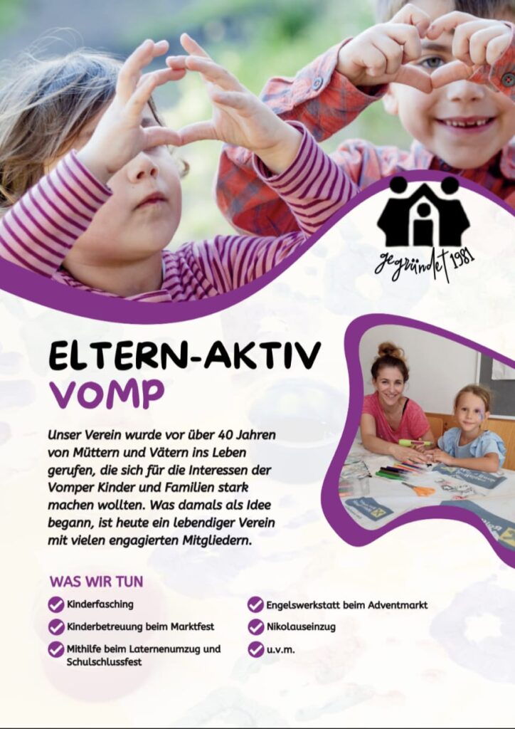 Der Flyer wurde bereits an alle Vomper Kinderkrippen, Kindergärten und die Volksschule verteilt – so können möglichst viele Interessierte erfahren, wer wir sind, was wir machen und wie man bei uns mitmachen kann.